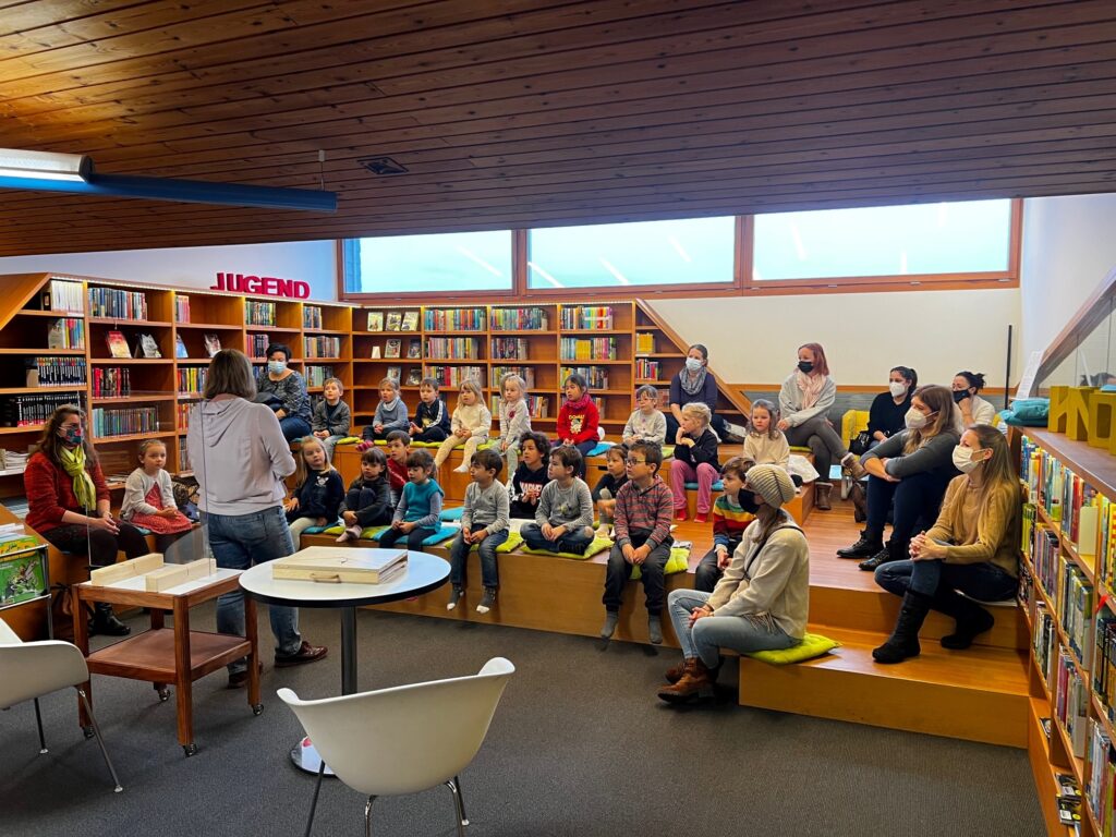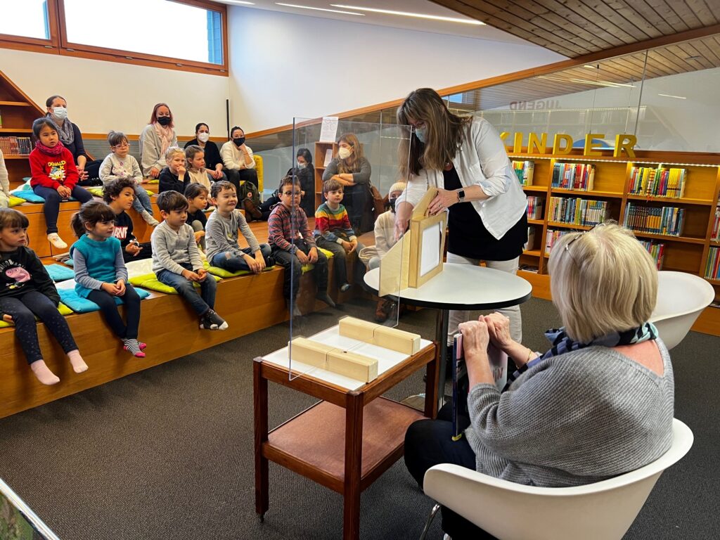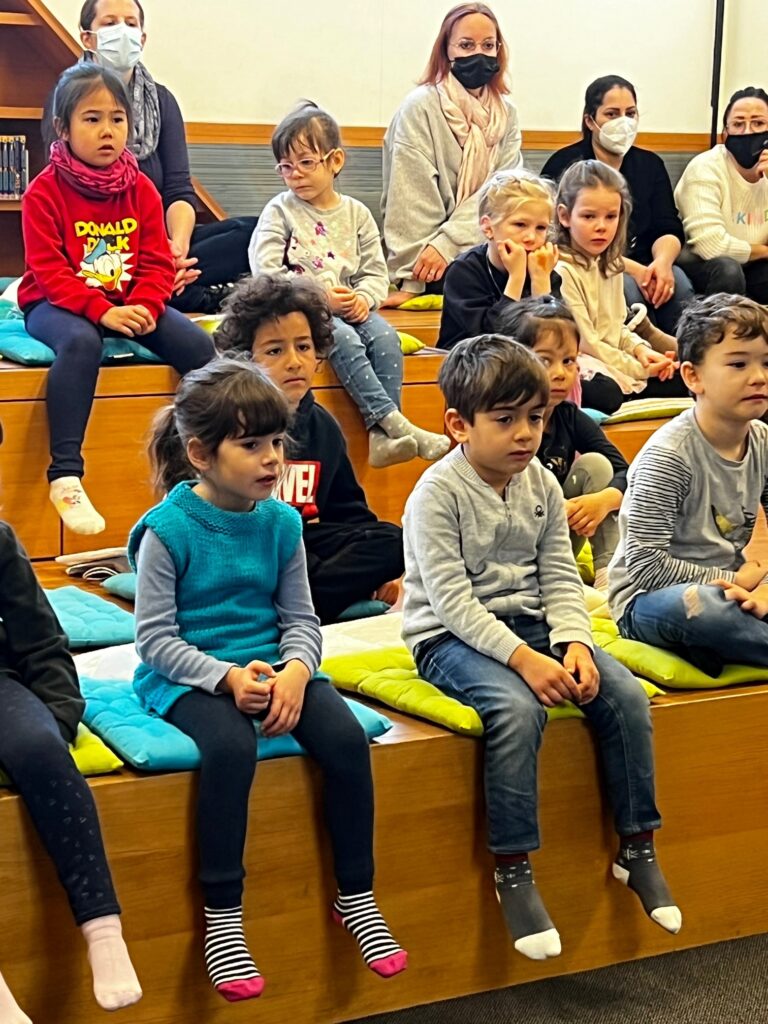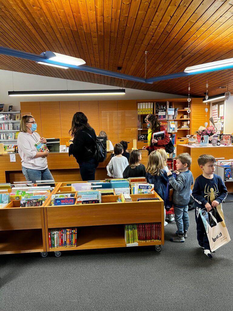Heute durften wir 25 Kinder vom «Eichholz-Kindergarten», 2 Betreuerinnen und 8 Mütter bei uns in der Bibliothek begrüssen. Nach einer Kamishibai-Geschichte wurde den Kindern von Frau Kast und Frau Lavelanet die verschiedenen Medien wie Hörbücher, Gesellschaftsspiele, Bilderbücher und Toni-Hörfiguren gezeigt, die sie in Zukunft in der Bibliothek ausleihen dürfen. Die Kinder wissen jetzt auch, wo sie die für sie altersgerechten Medien finden können. Im Anschluss durften sie bereits ihr erstes Bilderbuch ausleihen. In der Zwischenzeit erklärte Frau Bartl den interessierten Müttern, warum die Kinder ab 1. Kindergarten ein Schüler-Abo erhalten und warum «Lesen nicht erst in der Schule beginnt». Es wurden auch diverse Arten von Erstlese- und Vorlese-Büchern vorgestellt. So können die Eltern ihre Kinder beim «Lesenlernen» perfekt begleiten.