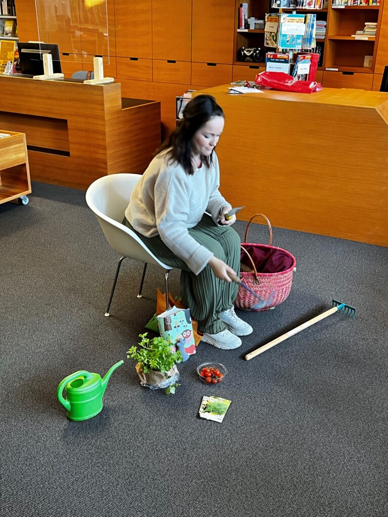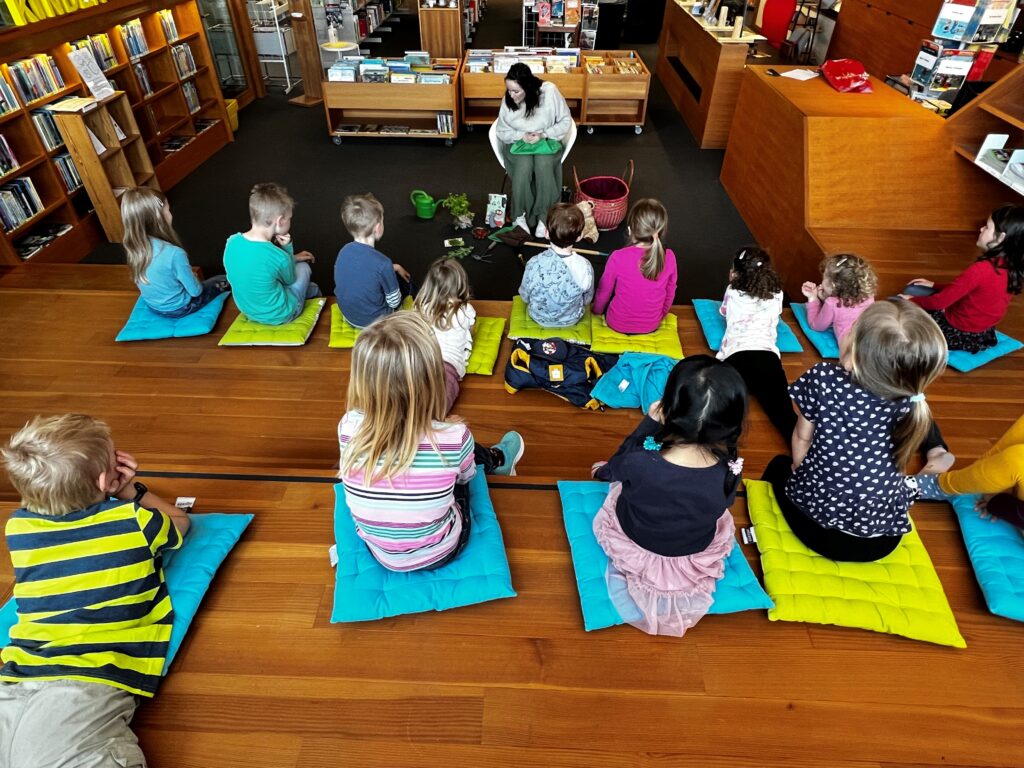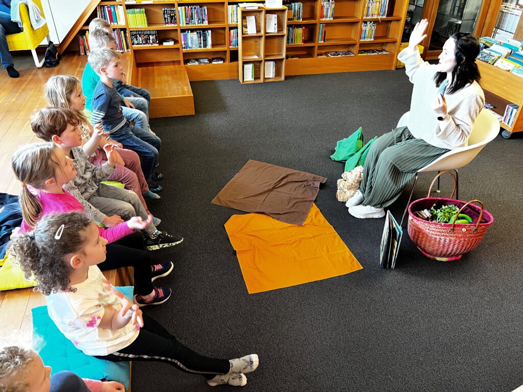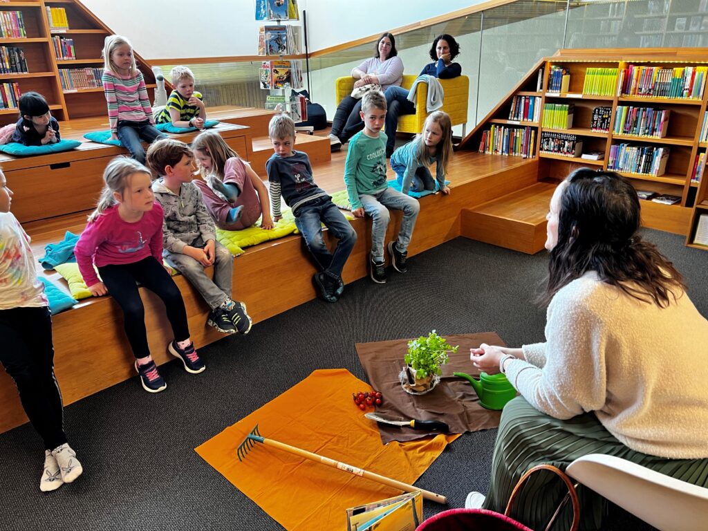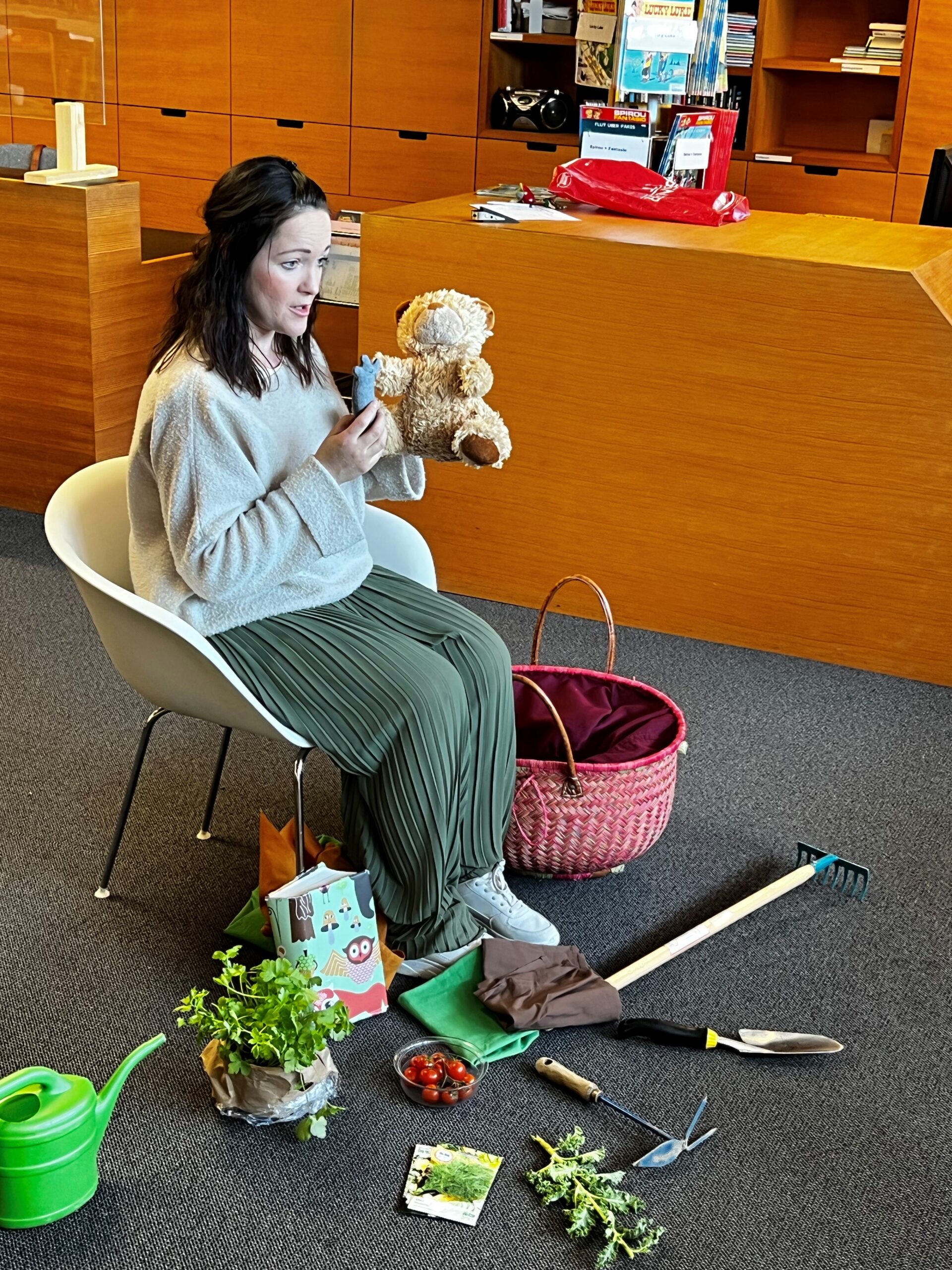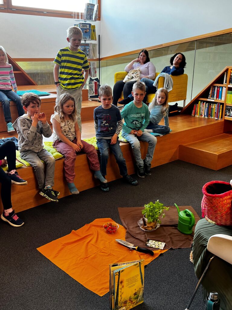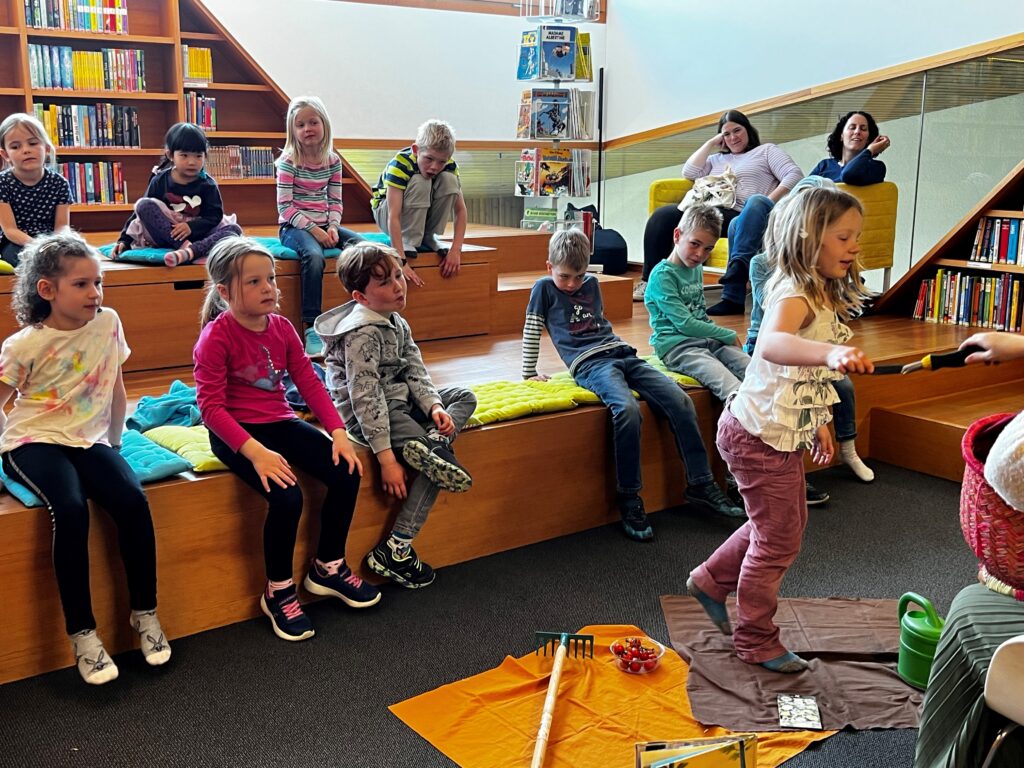 Gestern kam die «Läsemuus» das erste Mal zu uns in die Bibliothek auf Besuch. Begleitet wurde sie von Isabell Fessler, einer guten Freundin der kleinen Maus. Das war auch gut so, denn die kleine Maus, die in einem Buch wohnt, hat eigentlich Angst vor Erwachsenen. Sie freute sich aber riesig, dass 14 Kinder wegen ihr in die Bibliothek kamen um mit ihr zu singen und zu spielen. Die Maus brachte ein Buch mit und erzählte den Kindern die Geschichte von ihrem Bären-Freund. Dieser hatte im Wald einen kleinen Garten angelegt. Leider aber stibitzten andere Tiere seine Ernte und zerstörten den Garten. Das machte den Bären sehr traurig. Und so kam es zu der Frage, ob man einfach etwas nehmen darf? Oder wie die Tiere es hätten besser machen können, damit der Bär nicht traurig sein muss. Vor der Geschichte zählten die Kinder Tiere auf, die im Wald leben. Sie hatten auch grossen Spass an einem Ratespiel: auf einem Tuch lagen kleine Gartenwerkzeuge, Samenbeutelchen und Kräutertöpfchen. Abwechselnd merkte sich ein Kind die Gegenstände und ein anderes Kind durfte einen Gegenstand entfernen. Es war nicht immer ganz einfach, den fehlenden Gegenstand sofort zu erraten. Und weil die Kinder so lieb mit ihr waren und so toll mitgemacht haben, bekamen sie von der «Läsemuus» ein kleines Tütchen mit Kresse-Samen, damit sie diese in einen Topf aussähen können und so in ein paar Tagen etwas gutes für auf den Salat oder als Brotbelag ernten können. Nach ca. 50 Min. verabschiedeten sich die Kinder singend von der «Läsemuus». Manch ein Kind hörte ich zu den bereits wartenden Mutter sagen: » Mami, i wett s‘ nögscht mol au wieder goh. Chasch mi wieder amälda?»