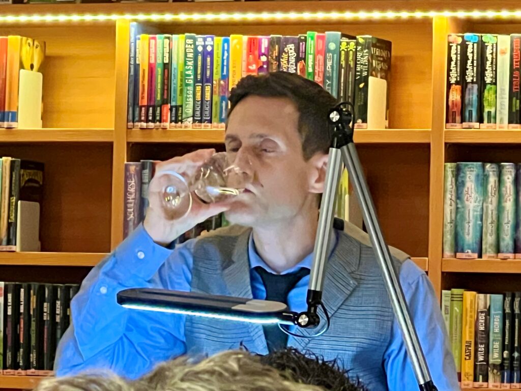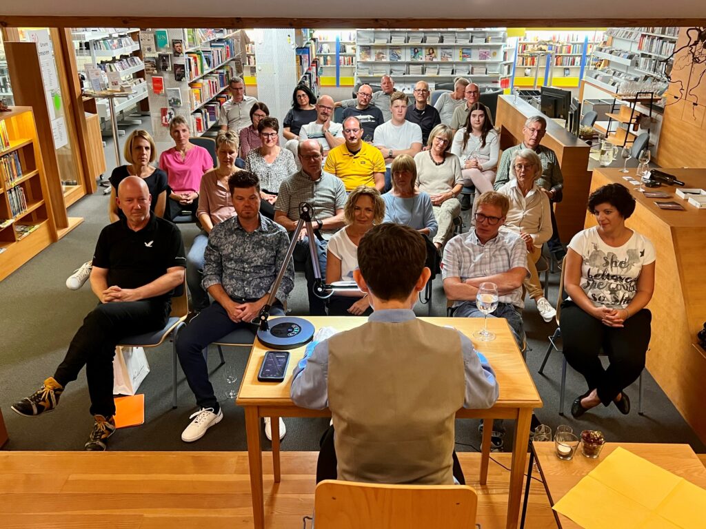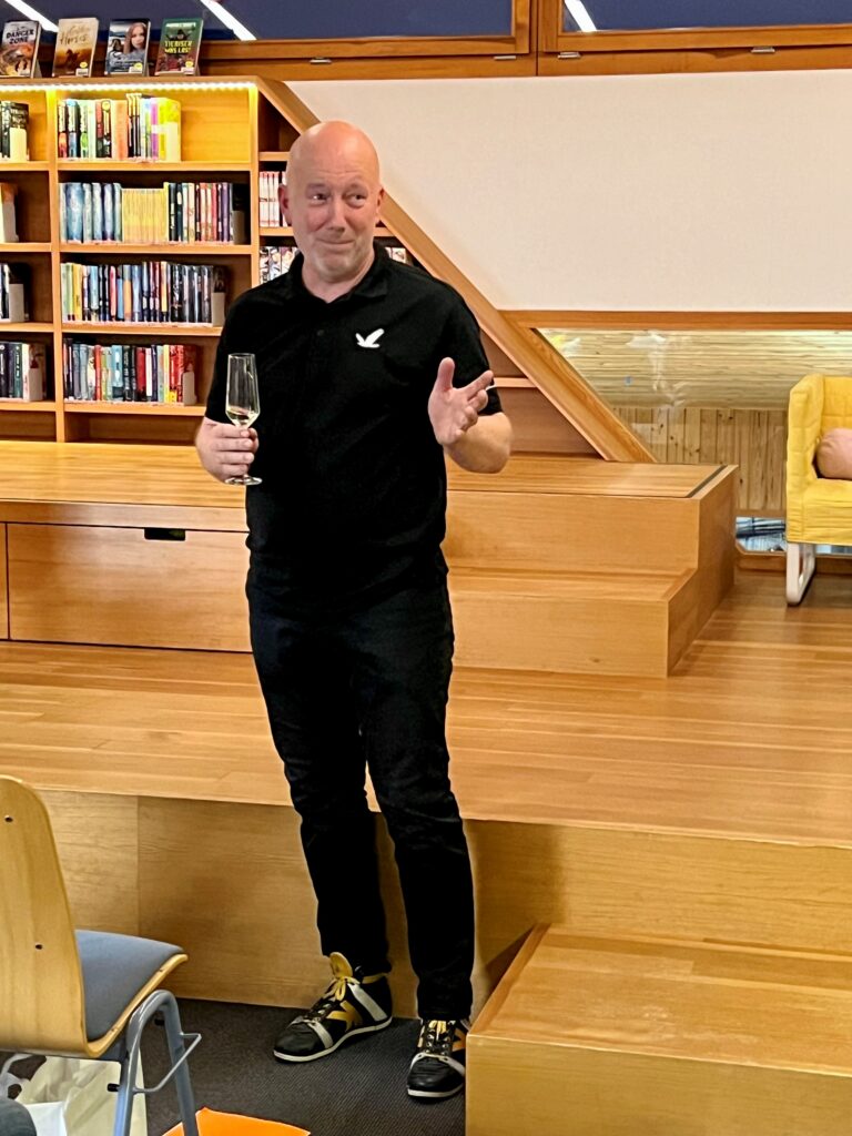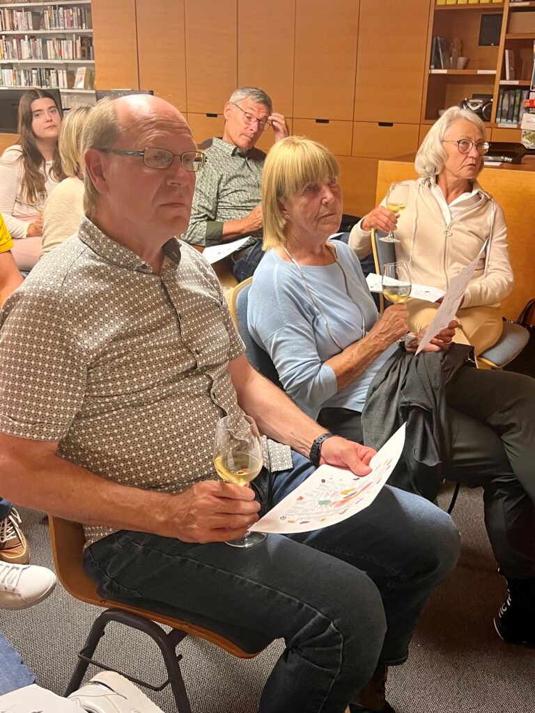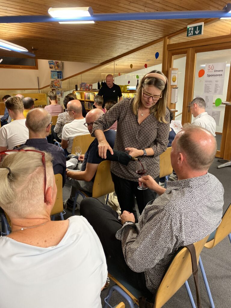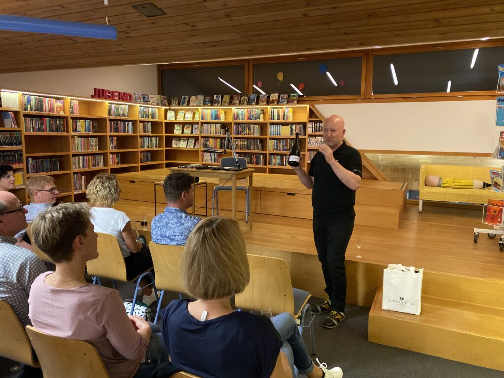 Trotz dem Start der Herbstferien war der «Wein und Crime» Anlass innert kurzer Zeit mit 30 Teilnehmern ausgebucht. Unsere Gäste wurden von Andres Stössel vom Weingut Schmidheiny und den Bibliothekarinnen im Foyer des KGH mit einem Schaumwein begrüsst. Gemeinsam ging es dann hoch in die Bibliothek, wo bereits Michael Schraner mit 3 spannenden, abgeschlossenen Krimigeschichten von namhaften deutschen Autoren auf die Teilnehmer wartete. Die Geschichten wurden vom ausgebildeten Schauspieler akzentuiert vorgetragen und passend zu den Geschichten kamen auch Requisiten wie z.B. Pistolen zum Einsatz, die die Spannung noch unterstrichen. Es war ein Erlebnis, einmal Geschichten so gekonnt vorgetragen zu hören.