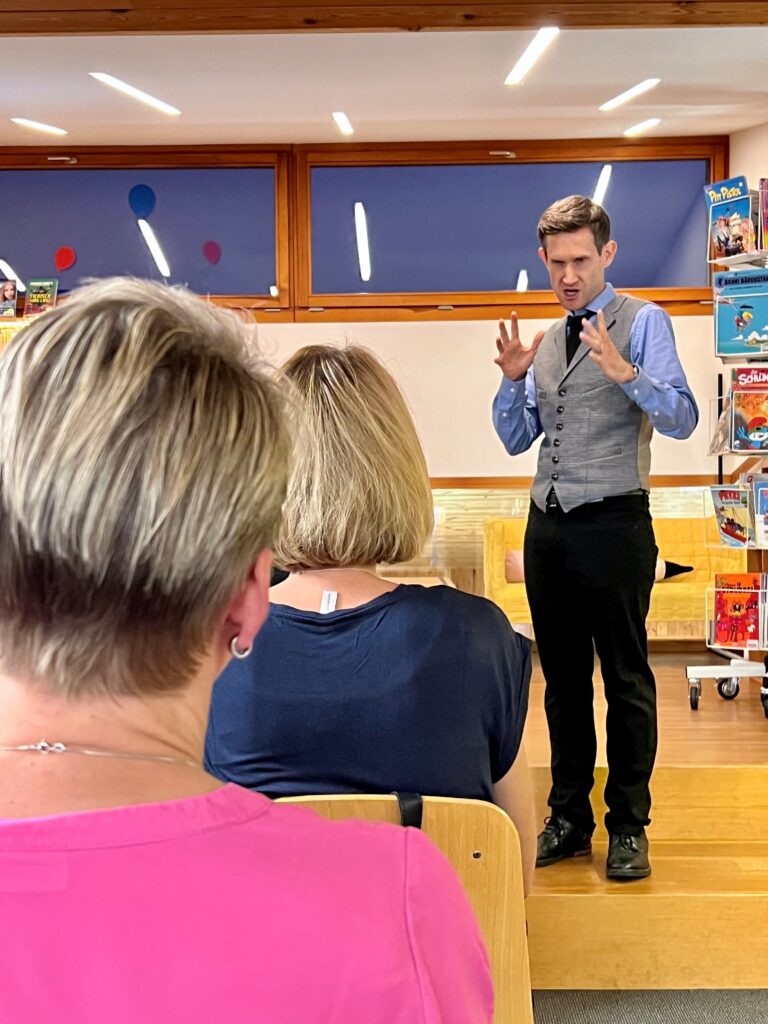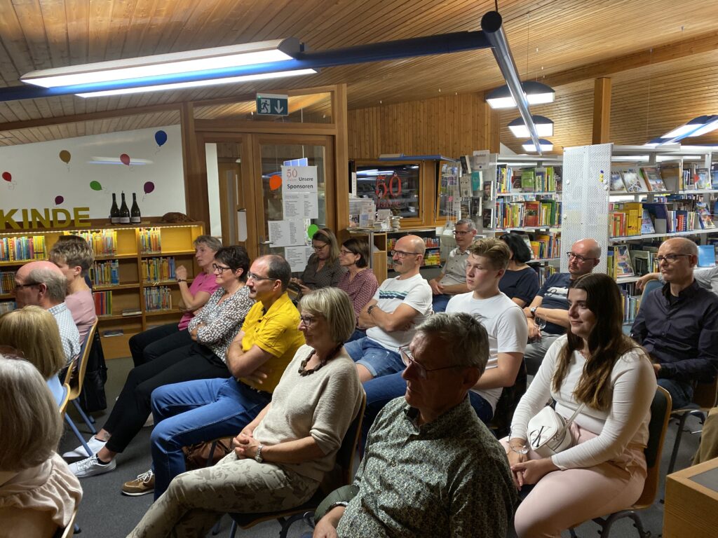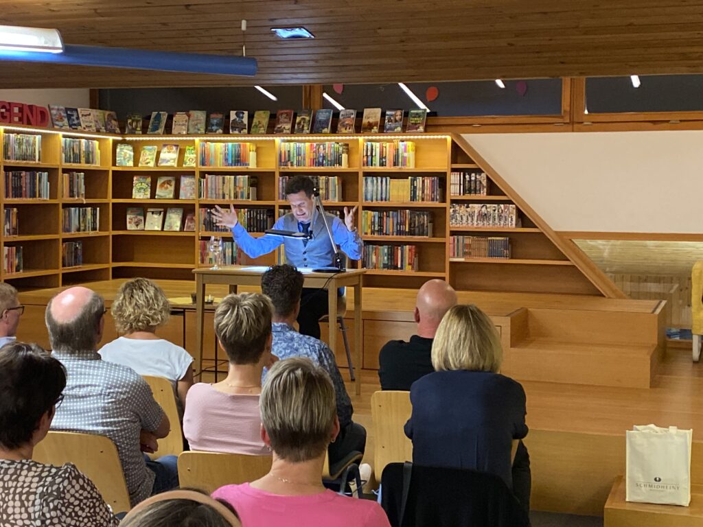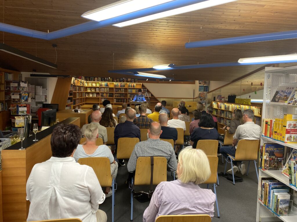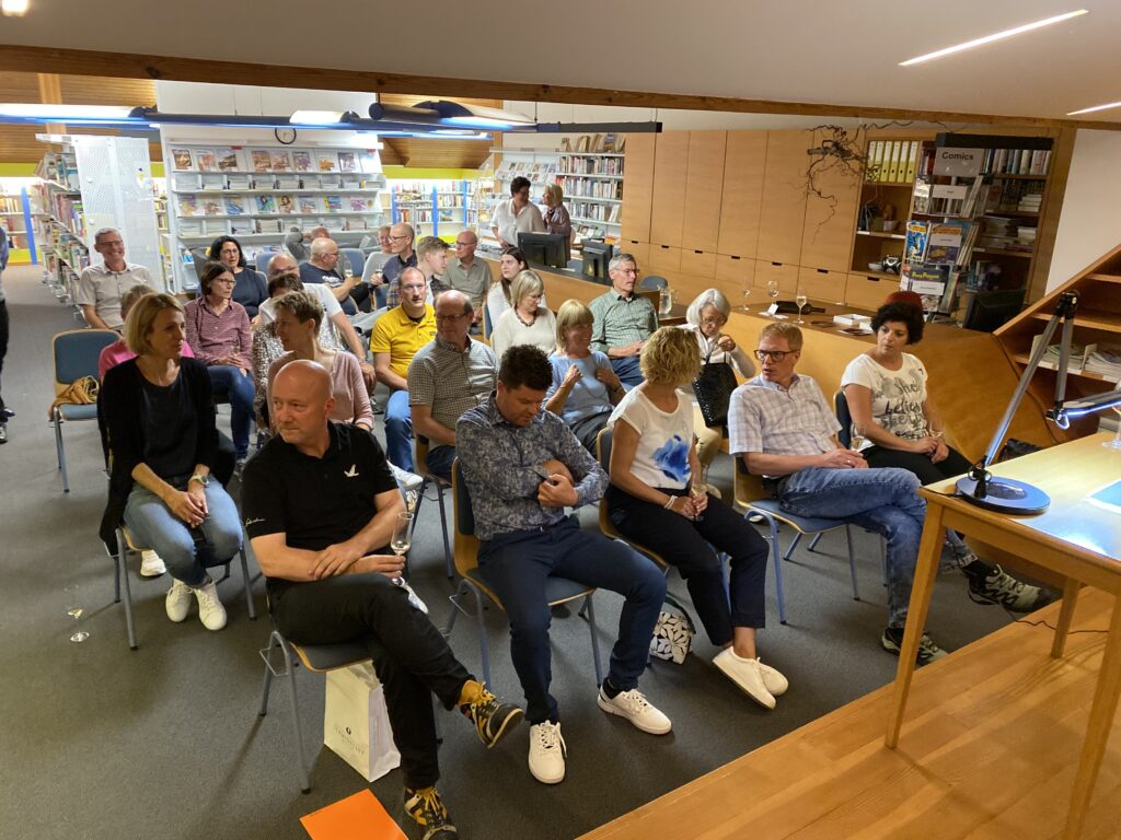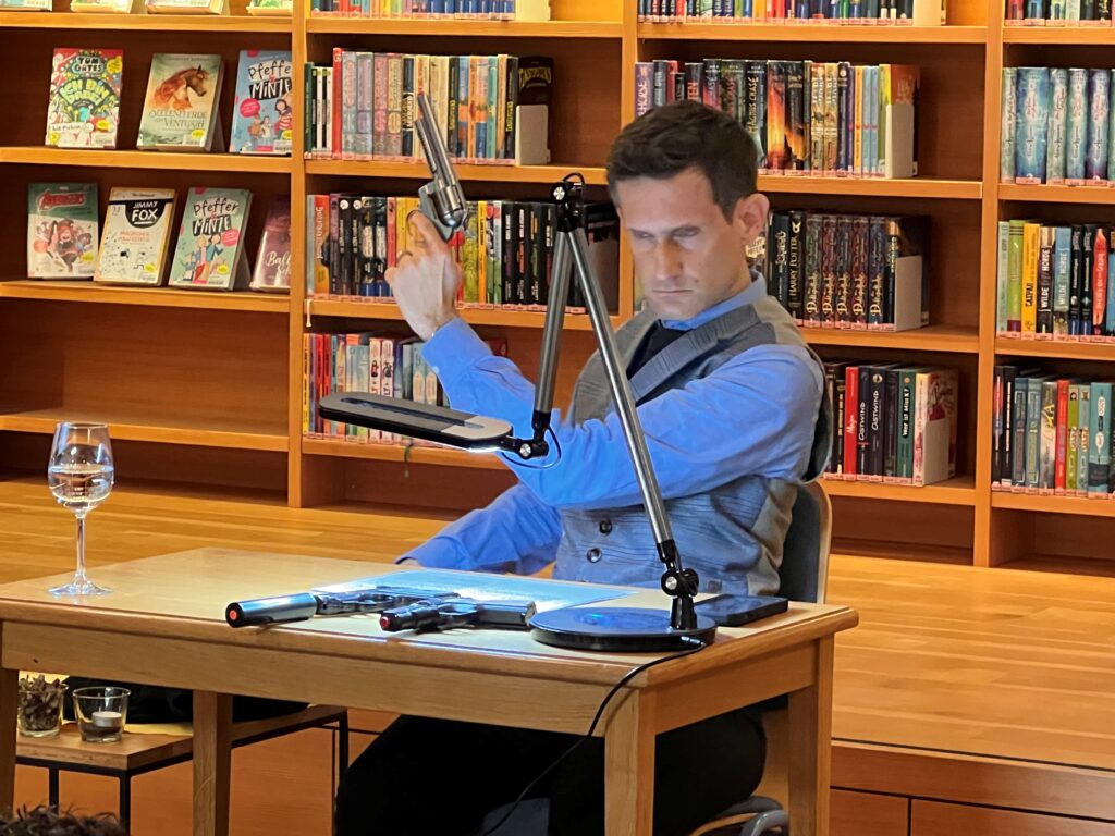 Trotz dem Start der Herbstferien war der «Wein und Crime» Anlass innert kurzer Zeit mit 30 Teilnehmern ausgebucht. Unsere Gäste wurden von Andres Stössel vom Weingut Schmidheiny und den Bibliothekarinnen im Foyer des KGH mit einem Schaumwein begrüsst. Gemeinsam ging es dann hoch in die Bibliothek, wo bereits Michael Schraner mit 3 spannenden, abgeschlossenen Krimigeschichten von namhaften deutschen Autoren auf die Teilnehmer wartete. Die Geschichten wurden vom ausgebildeten Schauspieler akzentuiert vorgetragen und passend zu den Geschichten kamen auch Requisiten wie z.B. Pistolen zum Einsatz, die die Spannung noch unterstrichen. Es war ein Erlebnis, einmal Geschichten so gekonnt vorgetragen zu hören.