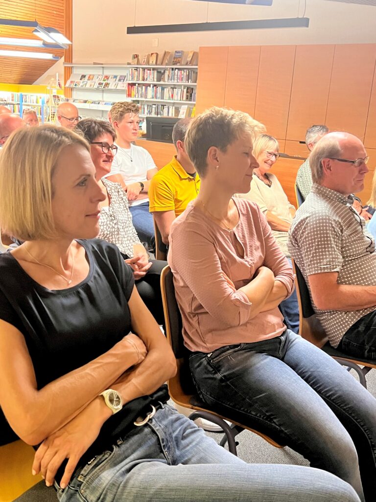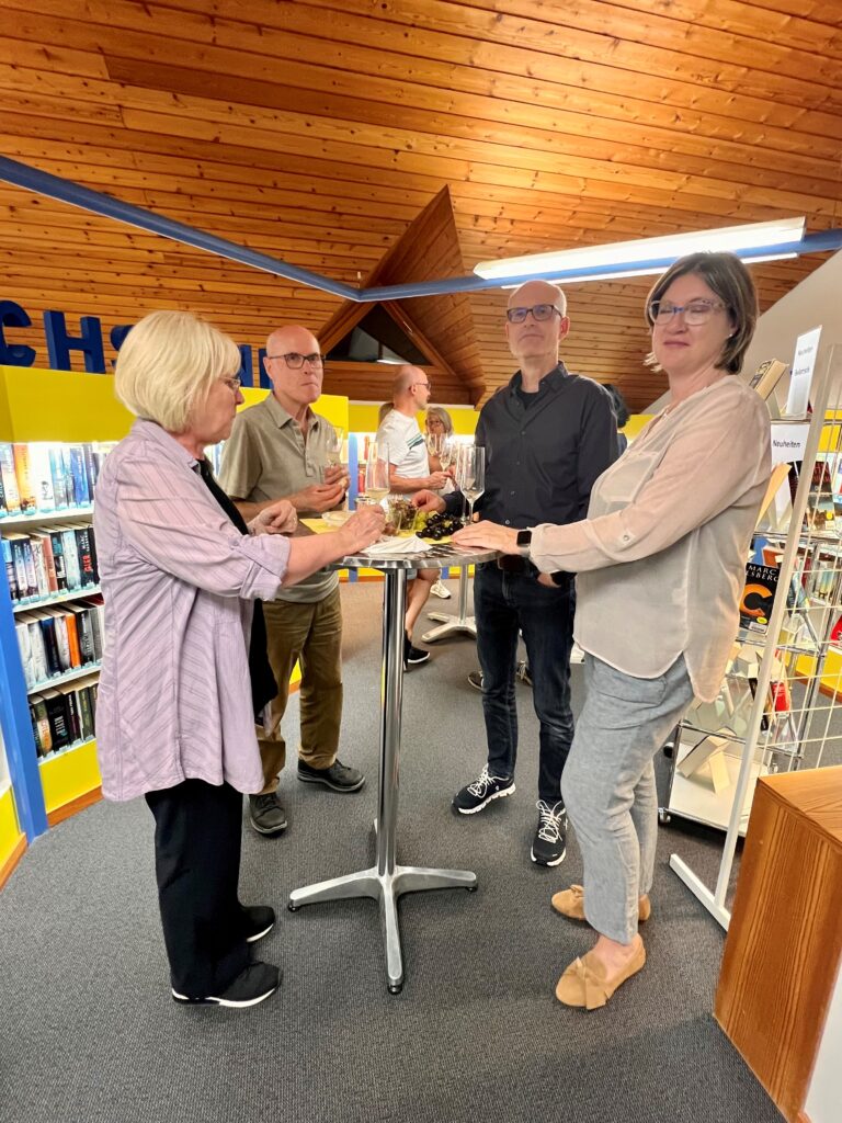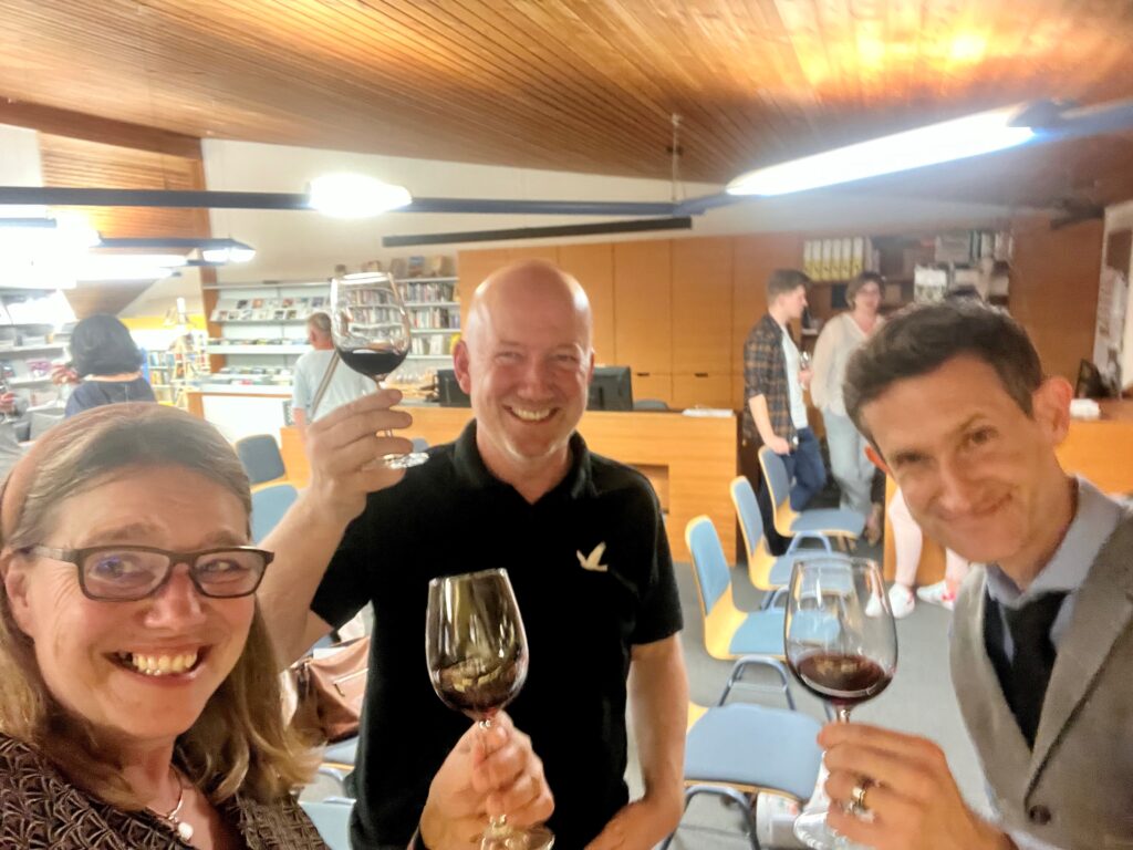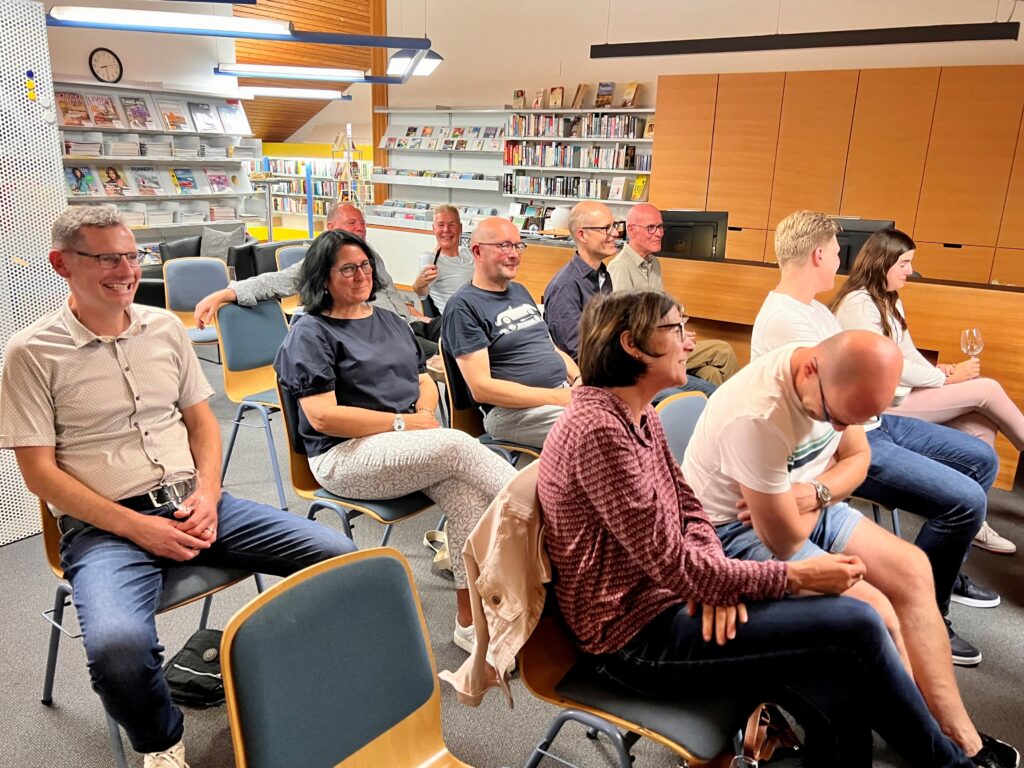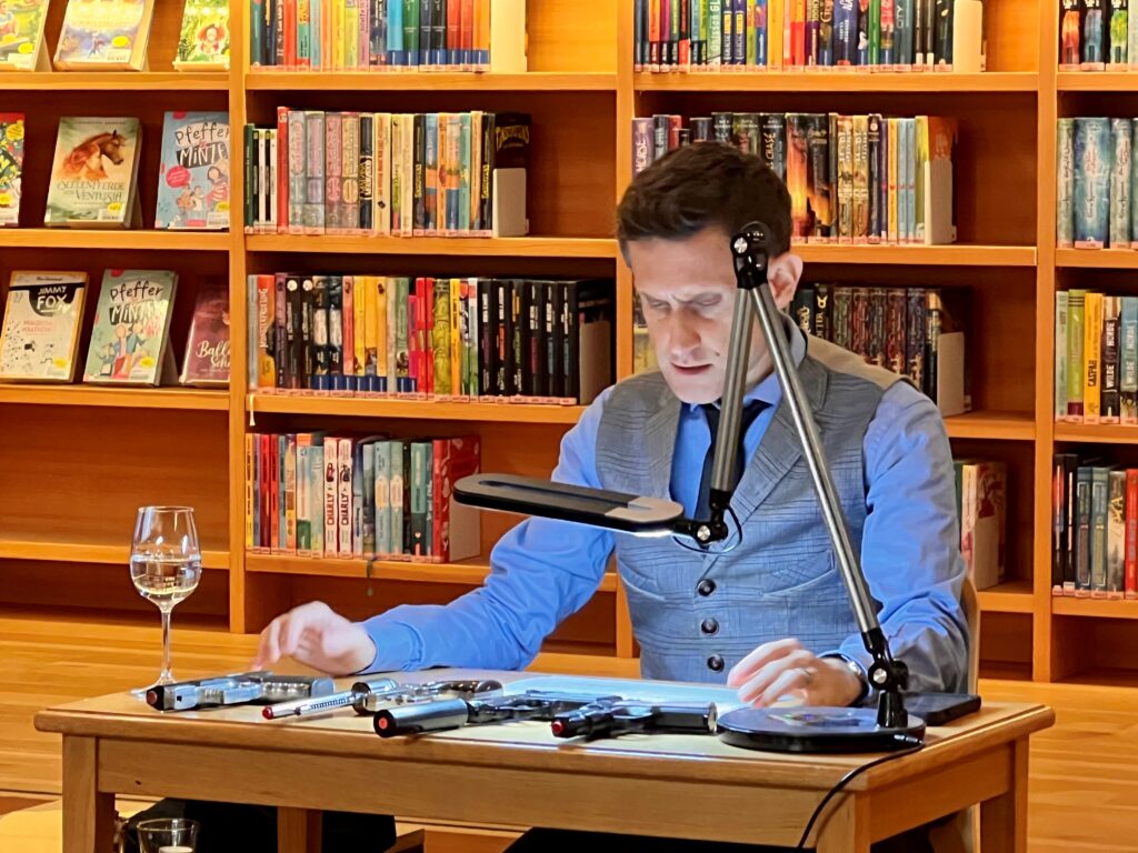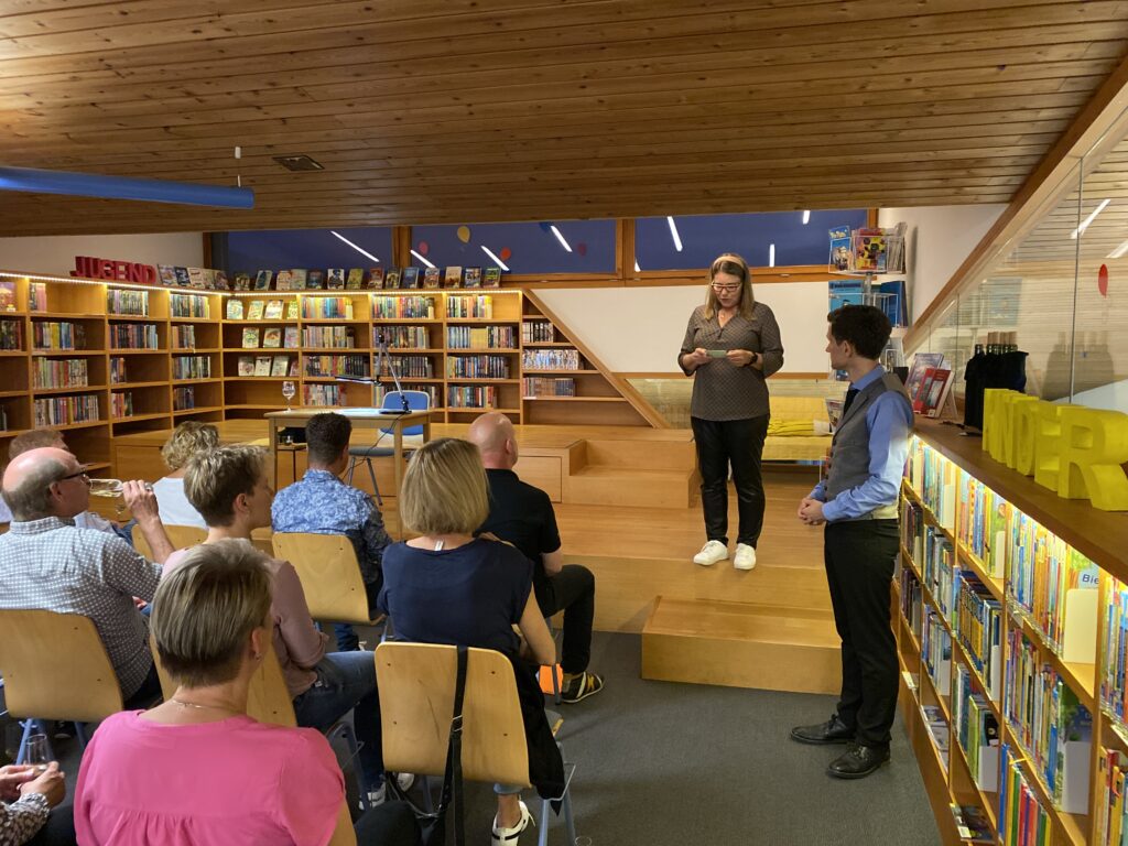 Trotz dem Start der Herbstferien war der «Wein und Crime» Anlass innert kurzer Zeit mit 30 Teilnehmern ausgebucht. Unsere Gäste wurden von Andres Stössel vom Weingut Schmidheiny und den Bibliothekarinnen im Foyer des KGH mit einem Schaumwein begrüsst. Gemeinsam ging es dann hoch in die Bibliothek, wo bereits Michael Schraner mit 3 spannenden, abgeschlossenen Krimigeschichten von namhaften deutschen Autoren auf die Teilnehmer wartete. Die Geschichten wurden vom ausgebildeten Schauspieler akzentuiert vorgetragen und passend zu den Geschichten kamen auch Requisiten wie z.B. Pistolen zum Einsatz, die die Spannung noch unterstrichen. Es war ein Erlebnis, einmal Geschichten so gekonnt vorgetragen zu hören.