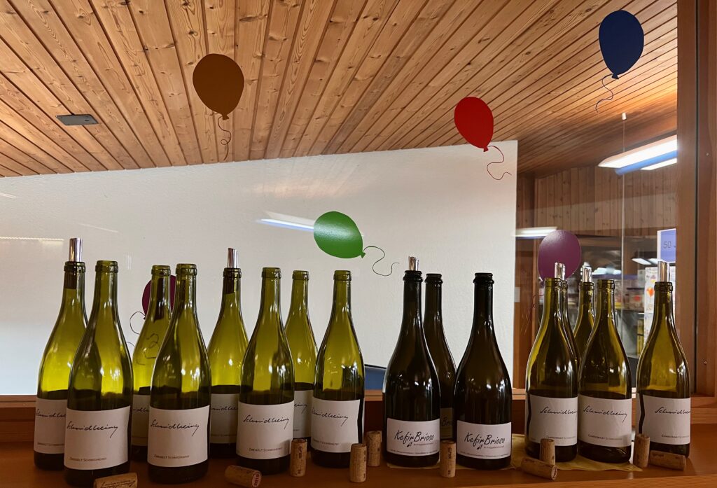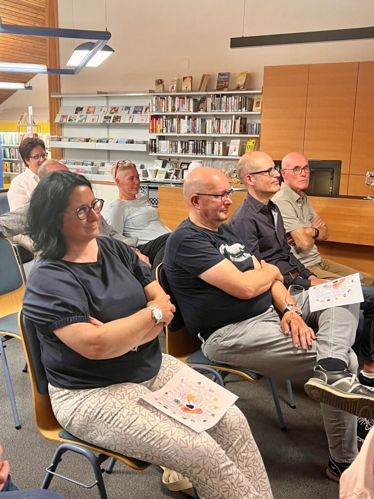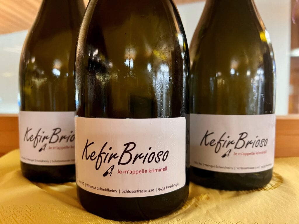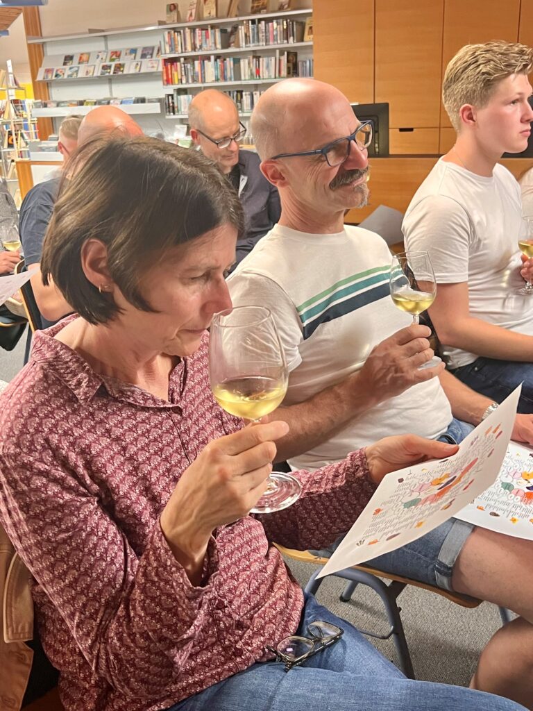 Zwischen den einzelnen Geschichten schenkte Andreas Stössel Weine aus, die zu den Geschichten entweder in der Rebsorte, der Gegend oder der Farbe passten. Extra für diesen Abend hat er den «Kefir Brioso -Je m’ appelle kriminell» mit passendem Etikett kreiert. Bei den verschiedenen Weinen durften wir alle mit Hilfe von einem «Aromarad-Blatt» selbst auf «Aromen-Spuren-Suche» gehen und schauen, ob wir die Weinaromen erkennen. Das war eine großartige kleine Einführung in die Welt der richtigen Weindegustation. Zwischen den Geschichten konnten sich die Gäste an den Stehtischen mit bereitgestellten Apèro-Häppchen über das Gehörte und die Weine austauschen.