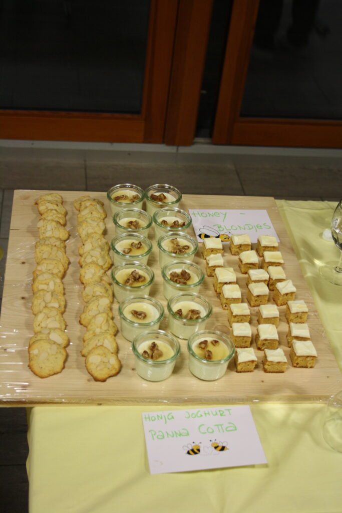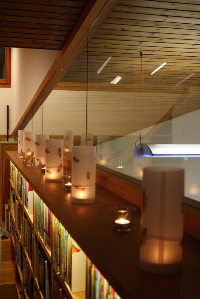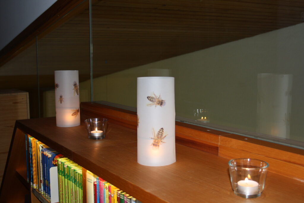 Wer einmal diverse Honigsorten nebeneinander probieren wollte, hatte die Möglichkeit, zwischen «Waldhonig», «Thymian-Honig», «Rosmarie-Honig», einem «Berghonig» und einem «Blütenhonig» zu vergleichen. Natürlich völlig Corona-Konform mit jeweils einem frischen Löffelchen. Bei einem Glas Wein oder Orangensaft und einem von uns Bibliothekarinnen zusammengestellten Apero verweilten die Besucher noch eine ganze Weile im Foyer des KGH, wo man sich über das eben gehörte austauschte oder sich auch sonst schöne Gespräche unter den Anwesenden ergaben. Wir glauben, dass es für alle ein gelungener, schöner und gemütlicher Abend war – so jedenfalls lauten die erhaltenen Rückmeldungen der begeisterten Besucher der Erzählnacht. Zum Abschied erhielt jede Person ein selbstgebasteltes «Bienen-Buchseiten-Zeichen» mit dem Dank: «thank you for bee-ing here!