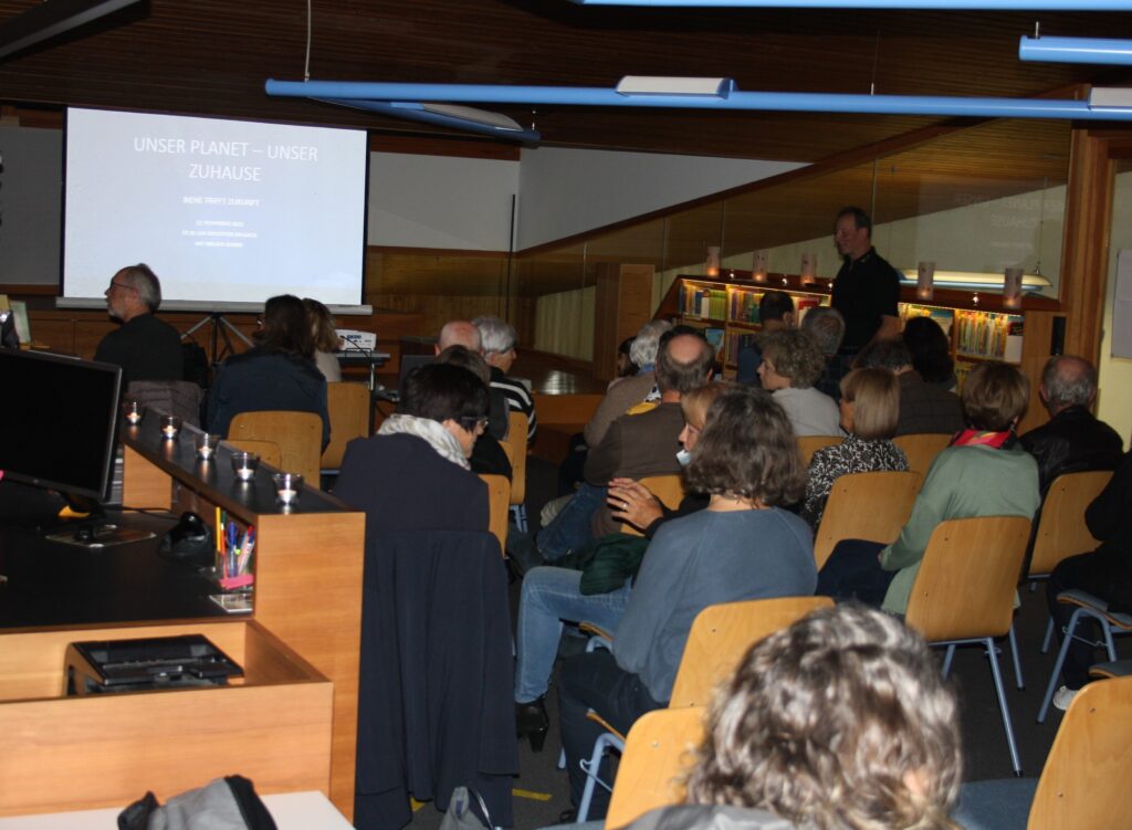 Trotz den Covidauflagen des Bundes kamen am Freitag, dem 12. November 2021 über 30 Personen zu uns in die liebevoll mit «Pappteller-Bienen» und «Bienen-Lichtern» geschmückte Bibliothek, um etwas über das Leben und die Zukunft der Bienen zu erfahren. Niklaus Geiger, Präsident des Imkervereins Unterrheintal und Halter von 15 Bienenvölker (zusammen mit Kurt Schmidheiny, Berneck) erzählte während kurzweiligen rund 1 ½ Stunden dem interessierten Publikum von seiner Arbeit als Imker und Bienenzüchter, dem Leben der Bienen, sowie auf humorvolle Weise Anekdoten von seinen «Anfängerfehlern» als Imker.  Ausdrücklich vom Referenten erlaubt, wurden immer wieder während der Präsentation direkt zum jeweiligen Thema Fragen gestellt. Die Themen reichten von den unterschiedlichen Arbeiten der Königin, der Arbeiterinnen und der Drohnen über die Behausung der Bienen (Waben), den Futterradius für die Pollensuche, Krankheiten und Schädlinge der Bienen (Varroa-Milbe) und deren Bekämpfung. Ein wichtiger Punkt war auch die Bepflanzung für bienenfreundliche Gärten (Biodiversität). Es wurden auch Beispiele gezeigt, wie man sogar Steingärten akzentuell bienenfreundlich gestalten kann. Wir erfuhren, dass eine Biene (leider) nur 5 Wochen lebt. In den ersten 4 Wochen sei ihre Hauptarbeit die Brutpflege und erst in der letzten Lebenswoche fliegt sie die Pflanzen für die Futtersuche an. Eindrücklich war auch veranschaulicht zu bekommen, dass eine Biene für 500g Honig ca. 2½-mal um die ganze Welt fliegen müsste. Sie befliegt normalerweise Pflanzen bis 300 m Radius zu ihrem Stock, findet sie aber in diesem Umkreis keine Nahrung, so kann sie den Radius bis zu 10 km erweitern, was aber eher selten der Fall sei. Niklaus Geiger brachte auch Anschauungsmaterial mit, unter anderem einen Wabenkasten, Wachsplatten und eine Platte mit abgetöteten Varroa-Milben. Diese sehr schwer zu bekämpfenden Schädlinge vermehren sich in der bereits «verdeckelten» Brut im Bienenstock und ernähren sich von der dort drinnen heranwachsenden Biene.